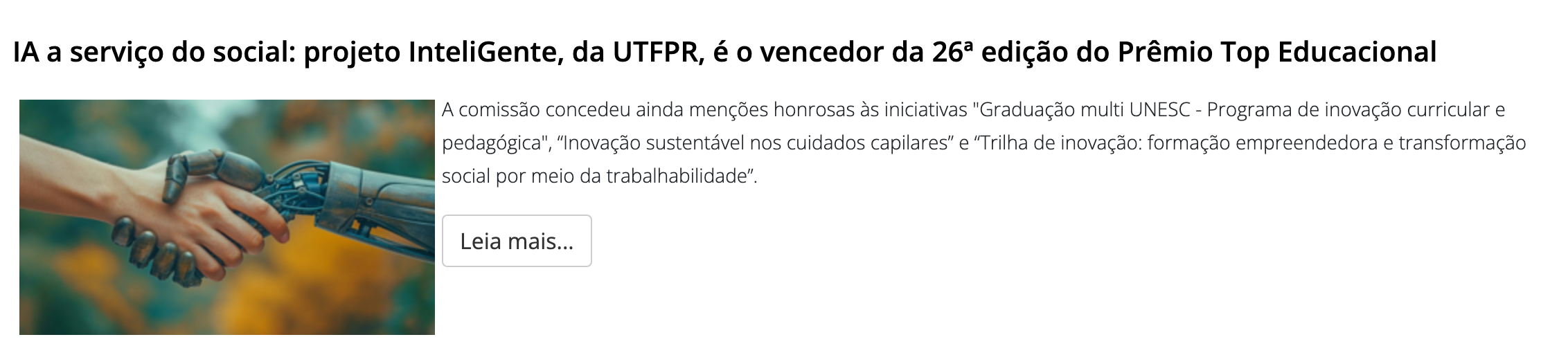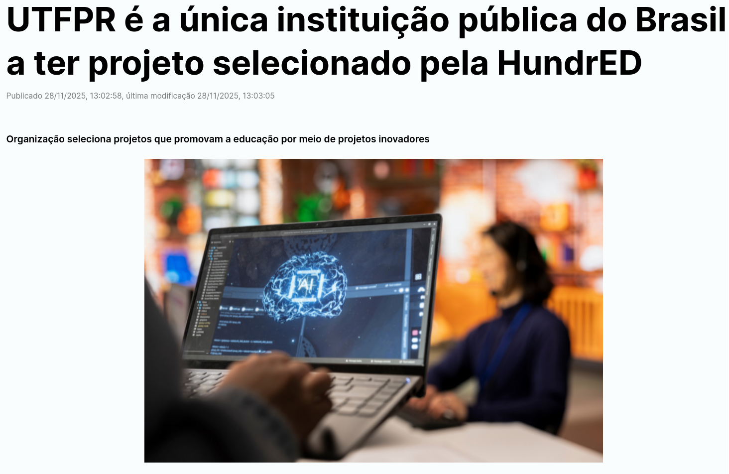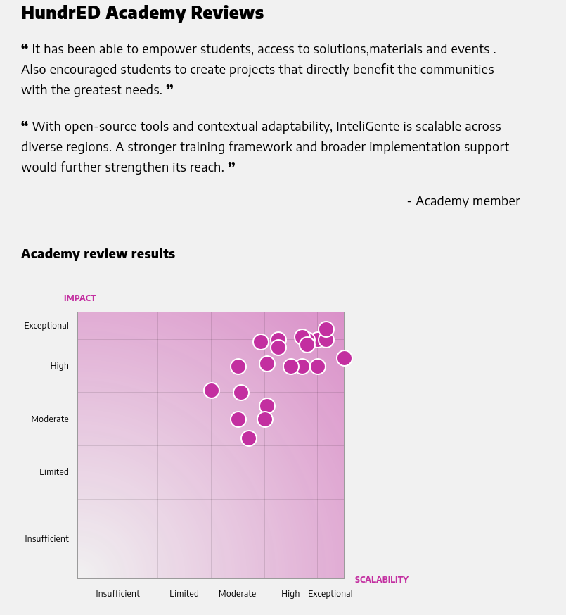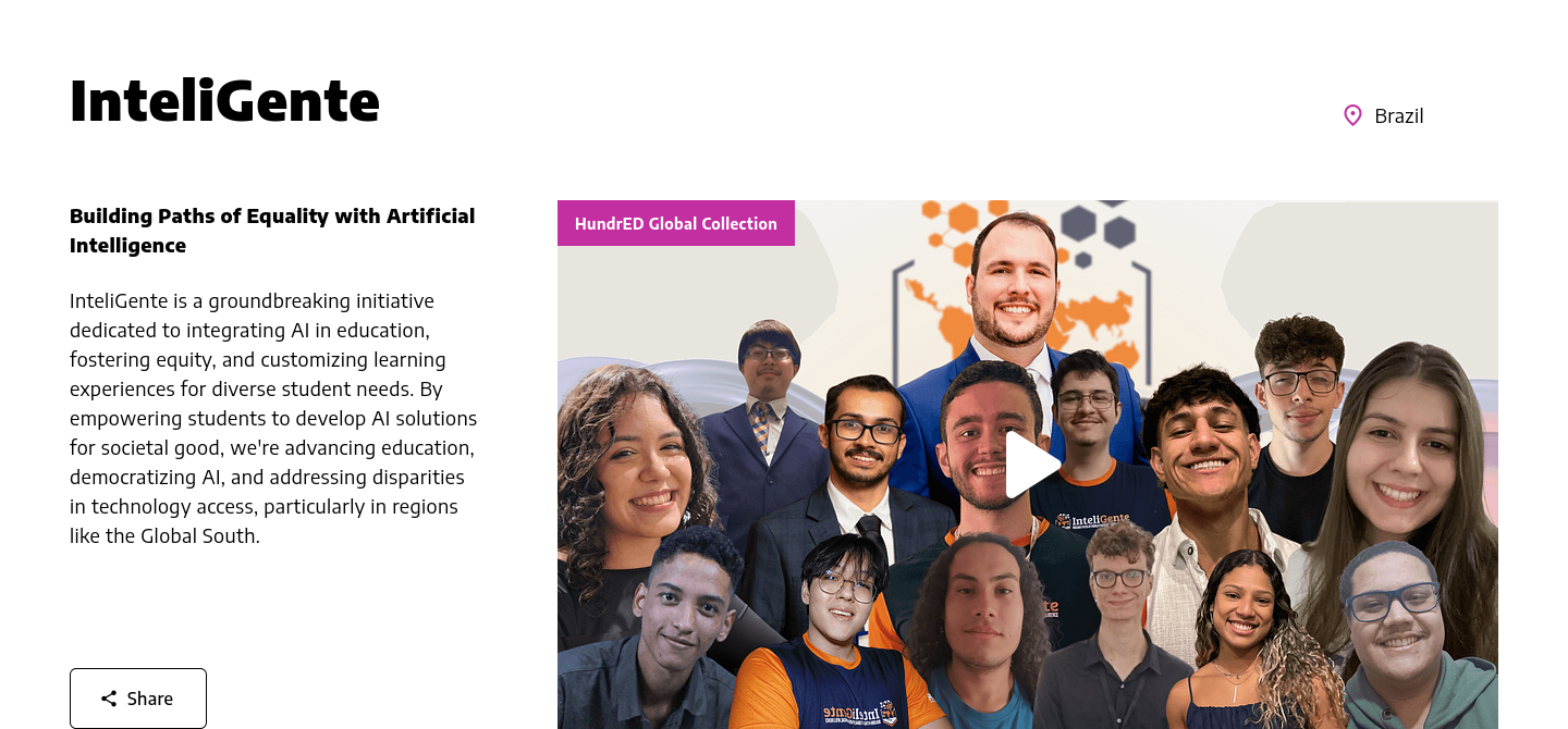 IRCAI – UNESCO | Top 100 Global AI Solutions for the SDGs (2025). InteliGente was selected among the world’s most impactful AI initiatives addressing the United Nations Sustainable Development Goals. Rated Excellent by international reviewers and included in the IRCAI Global Index of AI Innovations. One of only three Brazilian solutions featured in the 2025 global selection.