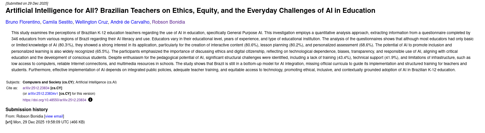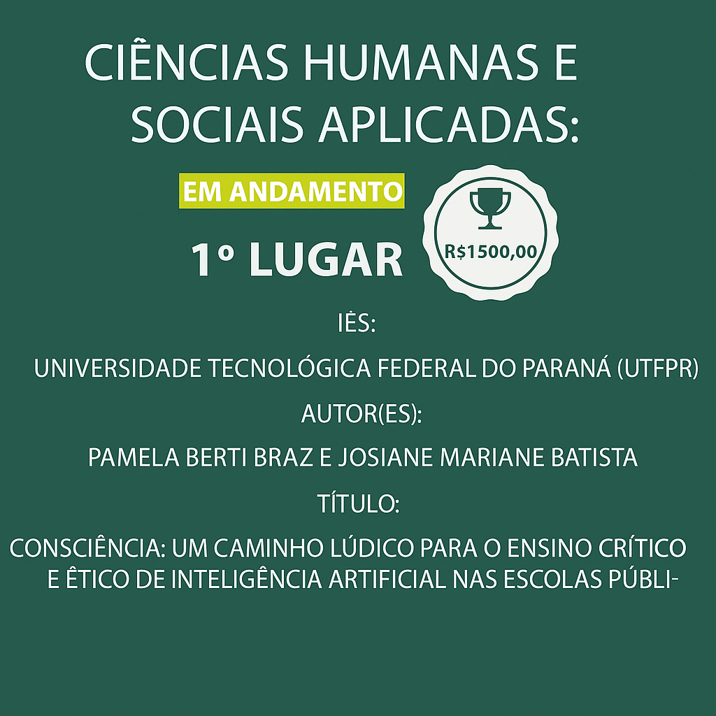 ConsCiêncIA Project (Literacy in Artificial Intelligence), recognized as the best ongoing research project in the field of Humanities and Applied Social Sciences in Brazil for undergraduate scientific initiation by Conic-Semesp (the Largest Scientific Initiation Congress in Brazil), among more than 1,400 registered projects, receiving R$1,500.