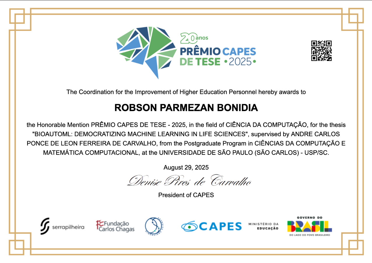 Dr. Bonidia and Dr. Carvalho are winners of the USP Outstanding Thesis Award 2025 (Prêmio Tese Destaque USP 2025), granted to the best doctoral thesis of the year in Exact and Earth Sciences by the University of São Paulo. This award recognizes research of excellence and high academic impact, and is one of the most prestigious distinctions from Brazil's leading public university and a reference in Latin America.