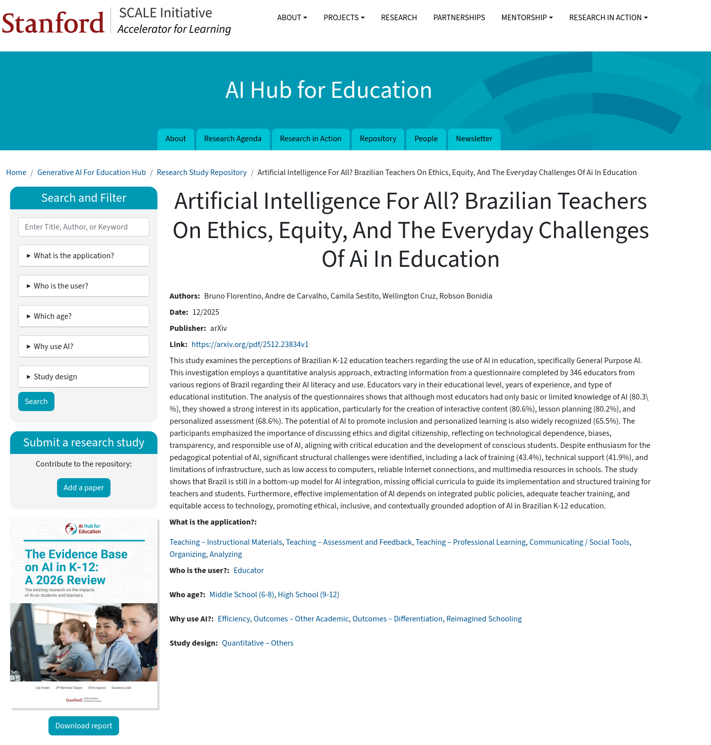 Our article “Artificial Intelligence for All? Brazilian Teachers on Ethics, Equity, and the Everyday Challenges of AI in Education” has been included in the official research repository of Stanford University's Generative AI for Education Hub, bringing together relevant scientific evidence on the use of AI in basic education.